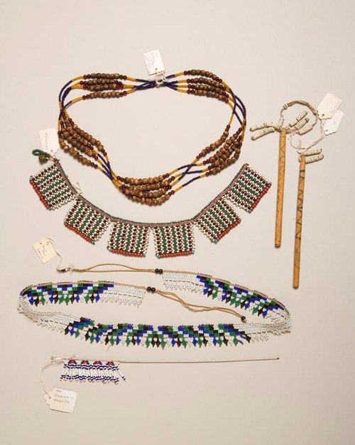 Wood, ostrich eggshell beads, thread